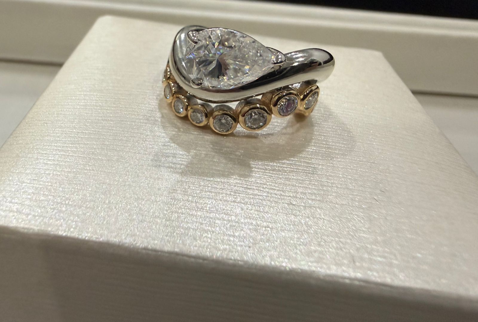 O destaque fica por conta da pedra de moissanite no tamanho 10x7 mm (2,50 quilates), conhecida por seu brilho intenso e aparência semelhante ao diamante, garantindo um visual luxuoso e moderno.